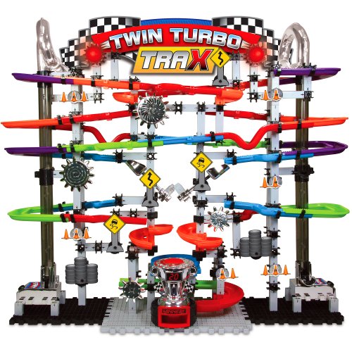 Twin Turbo Trax Marble Mania including bright LED lights, two velocity shooters, a full color instruction manual, dual racing tracks, and an electronic trophy time to add to the racing excitement.