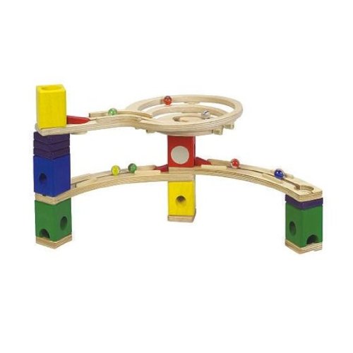 The Try Me set is the best set to learn basic building concepts of Quadrilla. Additional sets and accessories can easily be added offering endless possibilities. The 53-piece set includes curved wood tracks, a funnel and an assortment of blocks. Included in this particular set are: 1 spiral funnel track piece, 2 curved track pieces, 8 track joints, 13 height extenders, 9 track path altering pieces and 20 marbles. The track is made from birch wood and pieces have a natural or non-toxic painted finish. Largest piece is 14 x 8 inches, smallest piece is 1.0 x 0.75 inches.
